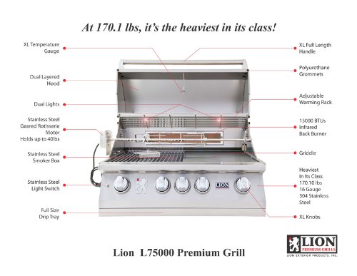 Lion 32 Inch Stainless Steel Natural Gas Grill On Cart. 75623 + 53621. Cart Mounted Gas Grills. Lion demonstrates their gourmet grilling expertise with the L75000 natural gas grill on cart. This stainless steel 32-inch BBQ grill has all the features and flare required to get your backyard barbecuing experience started. Five Lion Quick Lite valves ensure a fast, steady flame for grilling startup, and push-to-turn knob design simplifies operation. Commercial grade 304 stainless steel construction promises an unbreakable grill in your backyard. The double layer, seamless welded, stainless steel grill head with polished edges delivers durability to your grilling area. Four cast stainless steel burners push 60,000 BTUs of cooking power, and a 15,000 BTU infrared rotisserie back burner adds fuel to the fire! An XL temperature gauge makes monitoring your meal simple, and the two interior lights illuminate the grilling area so you can enjoy your Lion grill late into the evening. Premium solid stainless steel cooking grates resist wear and tear, and provide 577. 5 square inches of grilling space. Experience the benefits of a grilling gourmet package with the included rotisserie, cover, smoker box, griddle and griddle remover with bottle opener. The stainless steel construction of the included BBQ cart will stand up to the outdoor elements, making this grill and cart combo a lasting investment for your outdoor grilling area. Two access doors provide interior access to storage space and a paper towel holder, making it easy to keep your BBQ essentials at your fingertips.