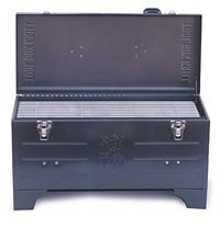 Designed to look like a tool box, this unique charcoal grill offers exceptional portability, starts up quickly, and doesn't require a lot of coals. The unit provides porcelain-coated high-heat components and a ventilated charcoal basket for efficient airflow, which helps ensure even heat across all 173 square inches of cooking surface. The grill can be used with the cover opened or closed, and its unique design eliminates the need for external vents that leak grease and ash. Since ashes and drippings stay inside, the compact grill can easily be stored--without making a mess--in a car, truck, camper, or boat, so it's always ready to go. Other highlights include 20-gauge steel construction, heat-resistant paint, and a durable built-in heat shield, which makes it safe to cook on wood or plastic tables. Great for at the beach, tailgating at the game, or camping out, the portable charcoal grill measures approximately 19-1/2 by 8-3/4 by 10-1/2 inches.